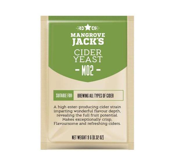 Дрожжи Mangrove Jack's «Cider M02» верхового брожения для приготовления сидра имеют высокий уровень выделения эфира, что даёт полностью раскрыться фруктовому аромату напитка. Это очень сильный штамм, который хорошо усваивает фруктозу и способен ферментировать её в сложных условиях и при разных температурах. Для большинства видов сидра это оптимальный вариант. Сидры, ферментированные с использованием этого штамма, имеют исключительно чёткий, ароматный и освежающий вкус.