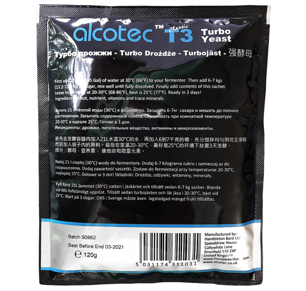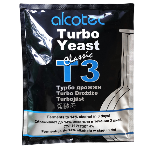 Дрожжи спиртовые Alcotec «T3 Classic» — классические и в то же время интенсивные турбо дрожжи от крупнейшего производителя дрожжей Alcotec. «T3 Classic» — это дрожжи с подкормкой, работающие эффективно и быстро, сбраживая и превращая сахара в спирт, делают брагу крепостью до 14% за 3 дня, поэтому дрожжи имеют индекс «T3» в своём названии.