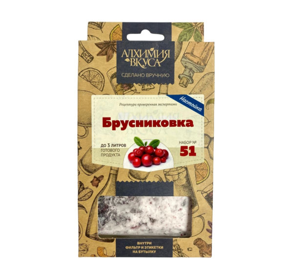 Крепкая горьковато-терпкая настойка на натуральных ягодах брусники с лимонной кислинкой. В набор для приготовления добавлена дубовая щепа для лёгкого древесного оттенка.