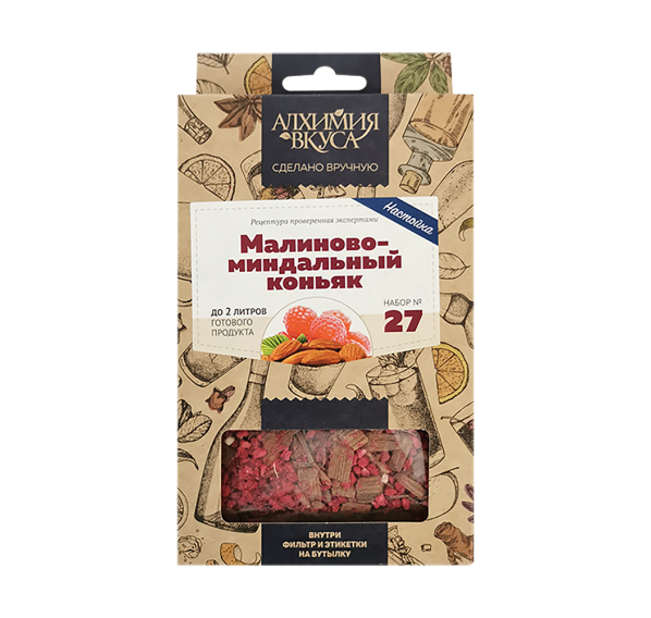 Изюм, миндаль дроблёный, малина сублимированная, чипсы дуба, миндаль очищенный обжаренный.