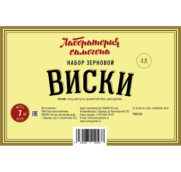 Односолодовый виски ирландского стиля. Набор сырья для приготовления 4 л виски. Солод дроблёный, готов к затиранию.