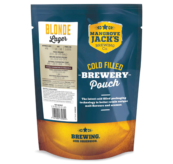 Солодовый экстракт Mangrove Jack's Blonde Lager весом 1,5 кг на 23 л домашнего пива — напиток бледно-золотистого цвета, с тонкой белой шапкой. Сладкий, фруктовый аромат, в котором яблочные ноты с мягким оттенком ананаса. Чистое и сухое послевкусие, в котором лёгкая горечь вместе с солодовым вкусом и оттенком яблока. В состав комплекта солодового экстракта входит: упаковка солодового экстракта и пакетик дрожжей; комплект рассчитан на приготовление 23 л пива в домашних условиях.