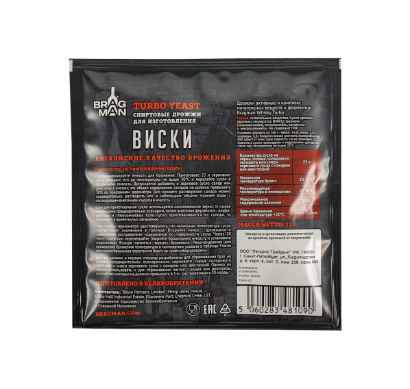 Дрожжи спиртовые Bragman Whisky включают в себя все макро и микро питательные вещества (в том числе азот, фосфор, магний и другие необходимые витамины и микроэлементы), чтобы получить солодовую (зерновую) брагу высочайшего качества, причём как из чистого зерна, так и из солодового экстракта.