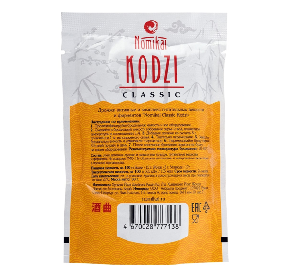 Спиртовые дрожжи Nomikai Kodzi Classic отлично подходят для новичков в работе с зерновым самогоном, а также опытным винокурам, которые экспериментируют с приготовлением напитков в условиях ограниченного свободного времени и городской квартиры. Кодзи — общее название для смеси спиртовых дрожжей, витаминов, питательных солей и специальной заквасочной плесневой культуры. Кодзи позволяют получить действительно вкусный продукт с приятным вкусо-ароматическим профилем исходного сырья. Перед использованием дрожжей Nomikai Kodzi Classic необходимо предварительно распарить сырьё.
