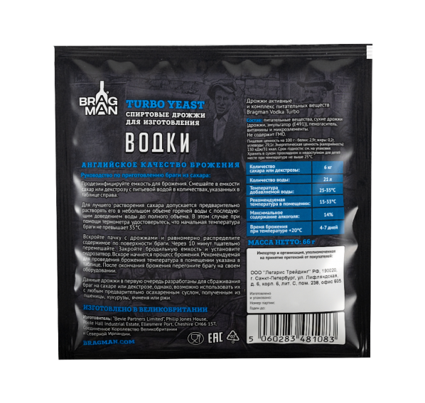 Спиртовые турбо дрожжи Bragman Vodka позволят Вам приготовить брагу высочайшего качества. После её перегонки Вы получите дистиллят или ректификат с тонким букетом и сбалансированным вкусом с минимальным количеством сивушных масел.