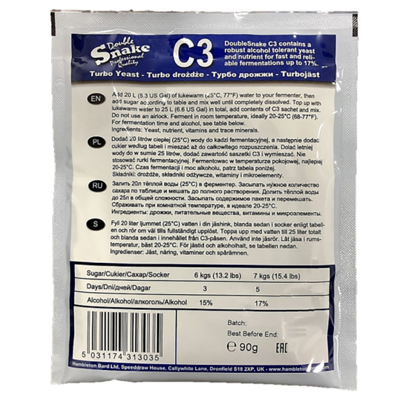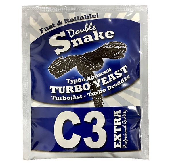 Спиртовые турбо дрожжи Double snake C3 отличающиеся повышенным выходом готового продукта. Турбо дрожжи Double snake C3 для самогона и спирта ректификата способные дать до 17% спиртуозности в браге, с минимальным количеством сивушных масел.
