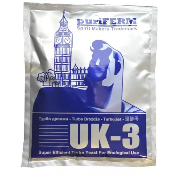 Спиртовые турбо дрожжи Puriferm UK-3 предназначены для работы с сахарным сырьём и/или декстрозой, рассчитаны на 21 л сусла. Турбо дрожжи Puriferm UK-3 обогащены минералами и витаминами, что даёт быстрое и чистое брожение. Готовый продукт на таких дрожжах не имеет неприятных запахов, обладает особенной мягкостью и чистотой. Турбо дрожжи Puriferm UK-3 не нуждаются в разбраживании, достаточно просто засыпать их в воду в которой растворён сахар.