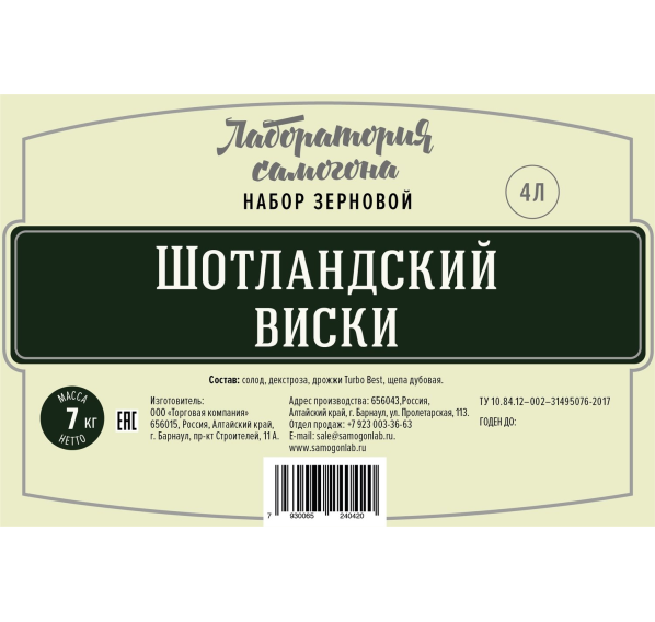 Набор сырья для приготовления 4 л виски в шотландском стиле. Солод дроблёный, готов к затиранию.