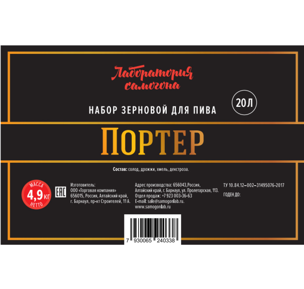 Набор сырья для варки 20 л пива. Солод дроблёный, готов к затиранию. Цвет: 60 EBC, горечь: 40 IBU, начальная плотность: 14 SG, алкоголь: 6% ABV.