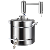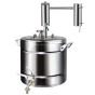 Сухопарник — ёмкость между баком и холодильником, предотвращает попадание вредных примесей в конечный продукт. Широкая горловина бака (11,7 см) даёт возможность с лёгкостью заливать брагу, а также мыть бак после использования. Классический змеевик в проточном холодильнике делает процесс конденсации пара эффективным, и на выходе Вы получаете уже охлаждённый продукт.