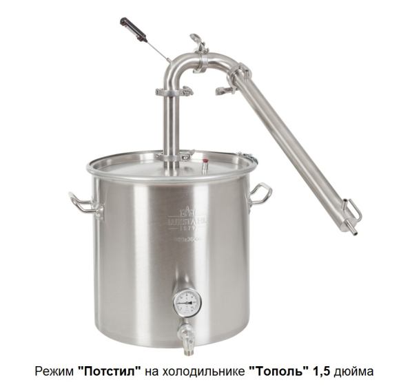Данный трубчатый холодильник 1,5" выполнен полностью из нержавеющей стали, имеет 4 трубки для охлаждения/конденсации паров спирта, атмосферный «носик» для связи с окружающей средой и укрепления продукта (в случае работы в режиме включенного дефлегматора — это очень актуальная функция). Имеет возможность установки на любые конструкции других самогонных производителей, так как имеет универсальное кламповое соединение 1,5". Диаметр основной трубы (кожуха холодильника) составляет 40 мм, диаметр трубок внутри холодильника составляет 10 мм. Общая длина кожухотрубного холодильника составляет 35 см.