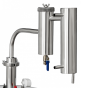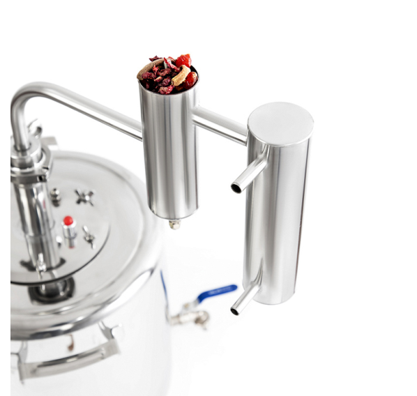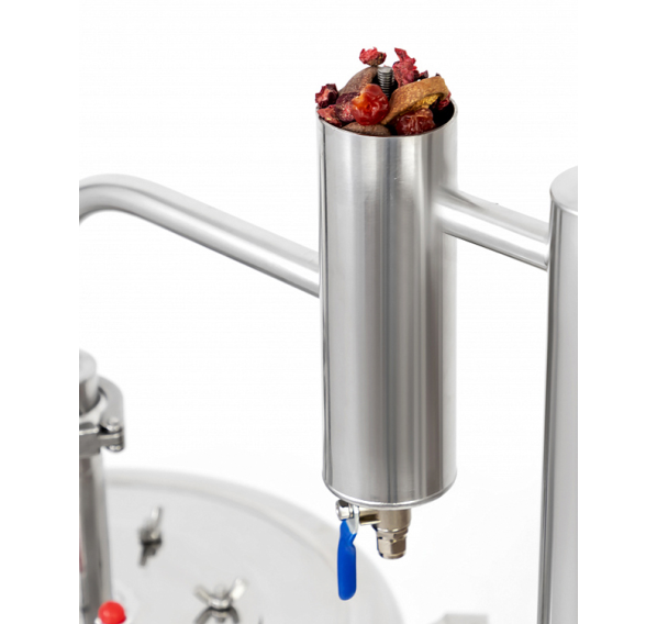 Сухопарник — ёмкость между баком и холодильником, предотвращает попадание вредных примесей в конечный продукт. Разборный сухопарник — это особенность дистиллятора «Феникс-Мечта-New», он выдаёт чистый продукт крепостью до 70%. С помощью сухопарника проводится и ароматизация напитка: положите в ёмкость кусочки фруктов, цитрусовые корки или пряности и получите авторский алкоголь с индивидуальным вкусом и ароматом. Важно соблюсти условие — наполнять резервуар только на 70%, чтобы оставалось место для спиртовых паров. Широкая горловина бака (11,5 см) даёт возможность с лёгкостью заливать брагу, а также мыть бак после использования. Классический змеевик в проточном холодильнике делает процесс конденсации пара эффективным, и на выходе Вы получаете уже охлаждённый продукт.