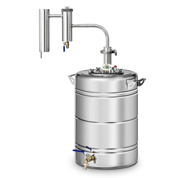 Сухопарник — ёмкость между баком и холодильником, предотвращает попадание вредных примесей в конечный продукт. Разборный сухопарник — это особенность дистиллятора «Феникс-Мечта-New», он выдаёт чистый продукт крепостью до 70%. С помощью сухопарника проводится и ароматизация напитка: положите в ёмкость кусочки фруктов, цитрусовые корки или пряности и получите авторский алкоголь с индивидуальным вкусом и ароматом. Важно соблюсти условие — наполнять резервуар только на 70%, чтобы оставалось место для спиртовых паров. Широкая горловина бака (11,5 см) даёт возможность с лёгкостью заливать брагу, а также мыть бак после использования. Классический змеевик в проточном холодильнике делает процесс конденсации пара эффективным, и на выходе Вы получаете уже охлаждённый продукт.
