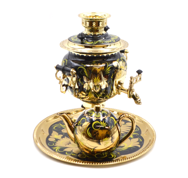 В наборе самовар электрический и классической формой корпуса, а также круглый, как солнце, поднос и изящный чайник для заварки. Шикарный набор, который может стать идеальным подарком на какое-либо торжественное событие. Эксклюзивная ручная роспись придает строгим формам набора светского шарма. А безупречное качество покрытия позволит Вам любоваться рисунками много лет.