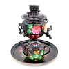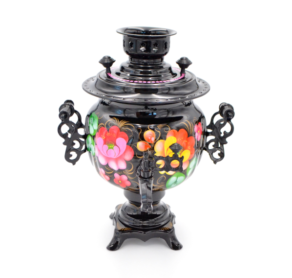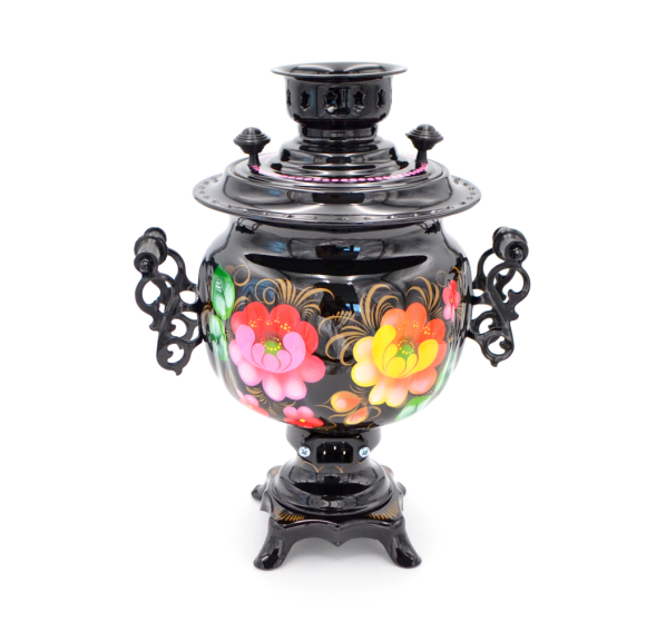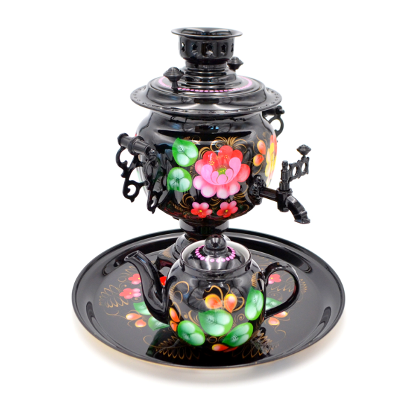 Комплект состоит из трех предметов: самовара, подноса и заварочного чайника, вручную расписанных профессиональными тульскими художниками. Характерной особенностью жостовской росписи являются различные цветы в простой композиции, что делает предмет необычайно легким и изящным. Самовар изготовлен из высококачественной латуни, внутренняя поверхность покрыта пищевым оловом, что придает чаю столь характерный своеобразный вкус. Керамический заварочный чайник и нержавеющий поднос являются неотъемлемой частью этого комплекта, прекрасно дополняя его.