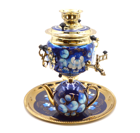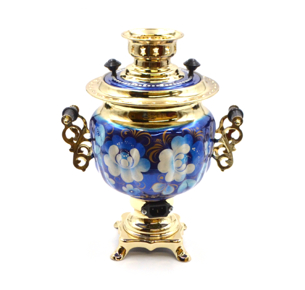 Встречайте! Великолепный электрический самовар объёмом 3 л в расписном наборе "Жостово на синем". Комплект состоит из трёх предметов: самовара, подноса и заварочного чайника, вручную расписанных профессиональными тульскими художниками. Характерной особенностью жостовской росписи являются различные цветы в простой композиции, что делает предмет необычайно лёгким и изящным.