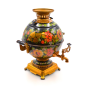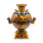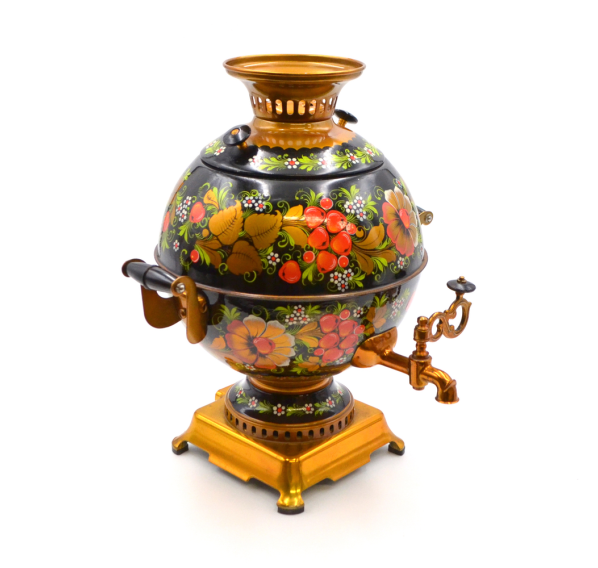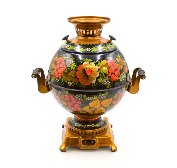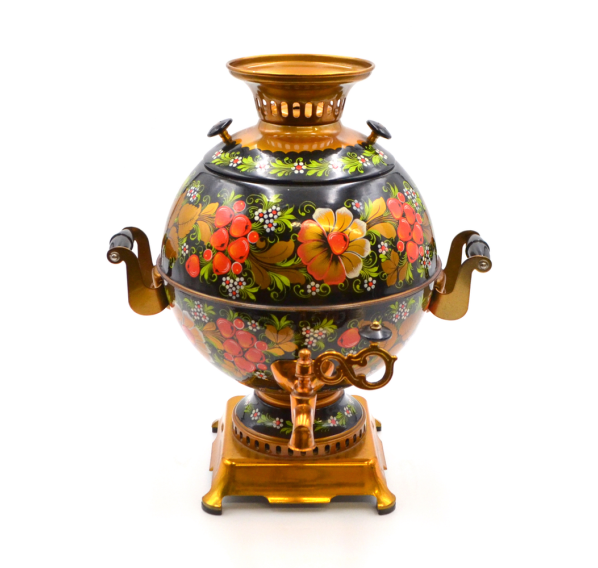 Самовар "Рябина на чёрном" — это расписной хохломскими узорами самовар шарообразной формы, которая делает его солидным, пузатым хозяином кухни. Он будет хорошо смотреться в загородном доме или на даче. Основной мотив рисунка — яркие грозди рябины. Нарядный красный цвет ягод выгодно смотрится на чёрном фоне.