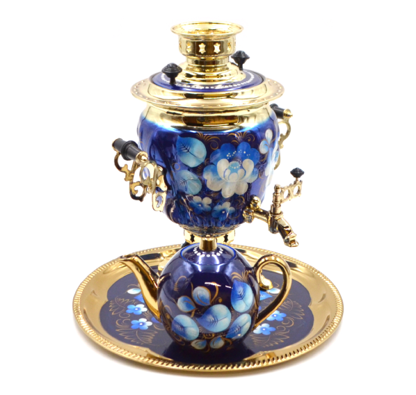 Встречайте! Великолепный электрический самовар объёмом 3 л в расписном наборе "Жостово на синем". Комплект состоит из трёх предметов: самовара, подноса и заварочного чайника, вручную расписанных профессиональными тульскими художниками. Характерной особенностью жостовской росписи являются различные цветы в простой композиции, что делает предмет необычайно лёгким и изящным.