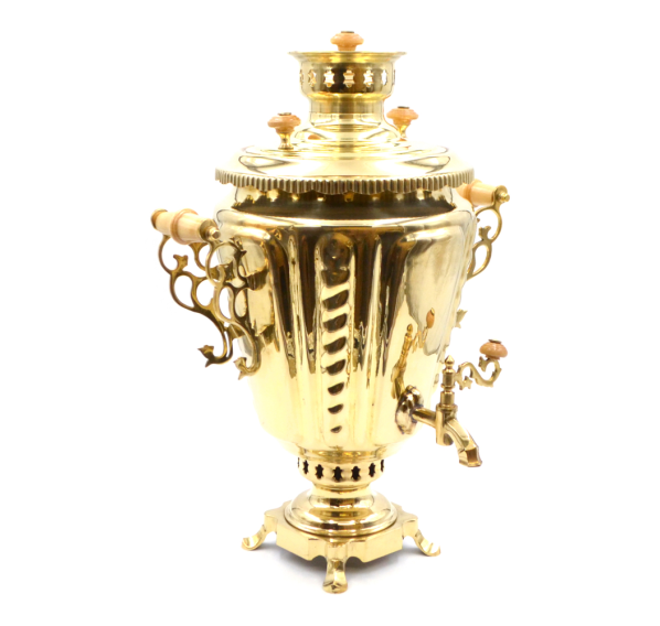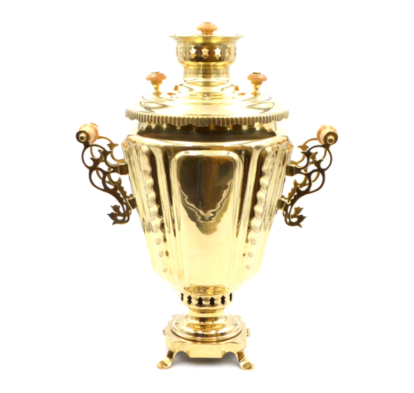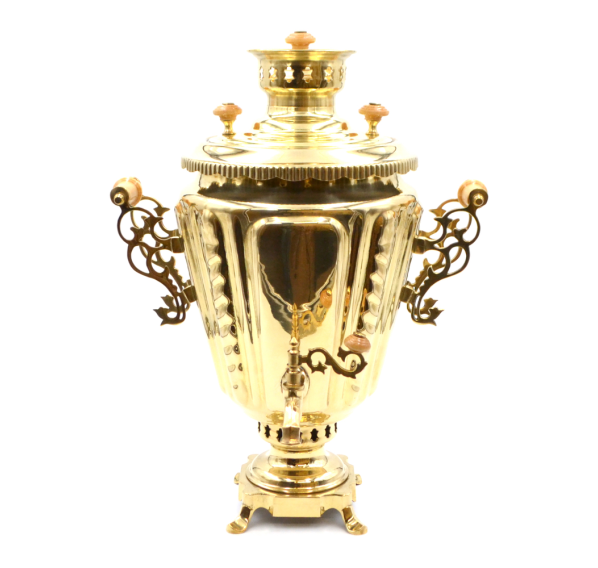 Жаровый самовар "Рифлёная рюмка" — эксклюзивный прибор, предназначенный для нагревания воды старинным способом с помощью шишек, щепок или древесного угля. Самовар формы рюмка изготовлен из высококачественной латуни с большим содержанием меди.