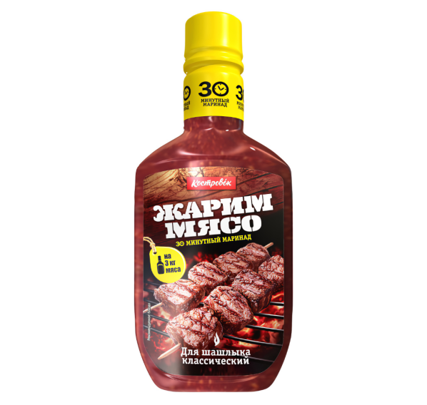Классический маринад для шашлыка подходит для шашлыка из свинины, курицы и баранины. "Жарим мясо" — это серия быстрых маринадов. Благодаря комбинации фруктово-винных кислот на маринование уходит всего от 30 минут. Маринад можно использовать для приготовления блюд на огне, гриле или в духовке. Одна бутылка рассчитана на 3 кг мяса или курицы.