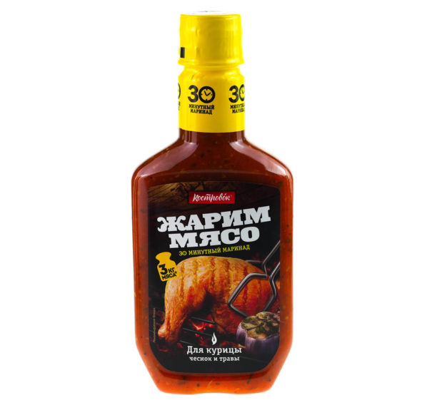 Маринад для приготовления курицы на гриле, мангале или в духовке. Продукт позволяет замариновать курицу всего за 30 минут, придаёт блюдам яркий вкус и сохраняет сочность мяса. Маринад содержит достаточное количество соли для приготовления. Одна бутылка рассчитана на 3 кг курицы.