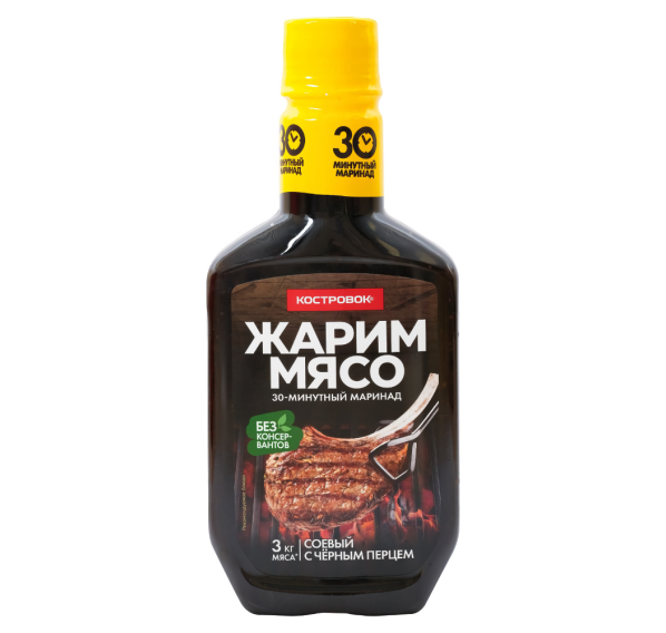 Соевый маринад с чёрным перцем предназначен для приготовления блюд из мяса и птицы. Он обладает тщательно сбалансированным составом, в который входят соевые бобы, репчатый лук, патока и другие ингредиенты. Маринад помогает придать готовым блюдам выразительный аромат и насыщенный вкус, а также сделать их более нежными и сочными. Одна бутылка рассчитана на 3 кг мяса или курицы.