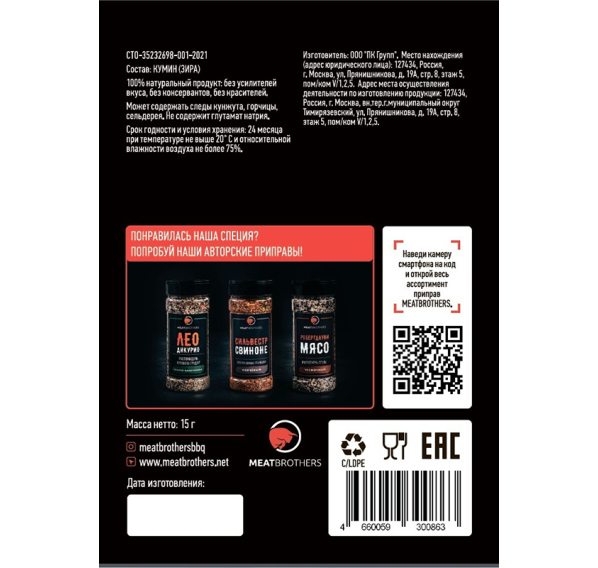 100% натуральный продукт: без усилителей вкуса, без консервантов, без красителей. Кумин (зира) может содержать следы кунжута, горчицы, сельдерея.