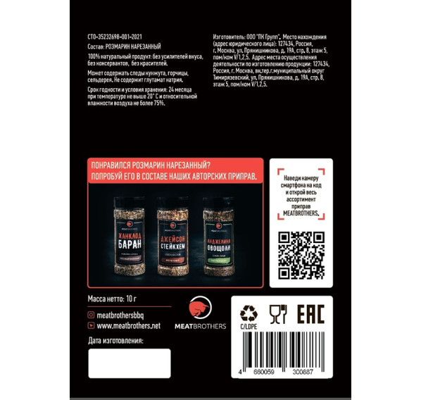 100% натуральный продукт: без усилителей вкуса, без консервантов, без красителей. Розмарин может содержать следы кунжута, горчицы, сельдерея.