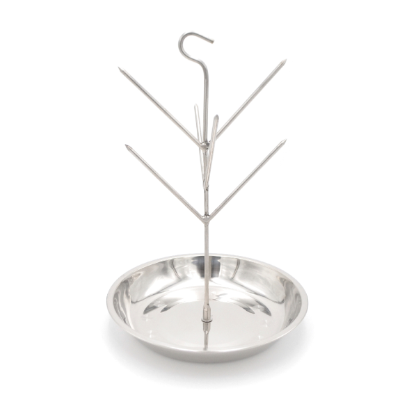 Ёлочка 28 см с низким бортом имеет крюк для крепления к тандыру, 6 заострённых шипов и миску с низкими бортами для сбора жира/сока, а также конструкция позволяет готовить овощи и грибы, не опасаясь, что они могут соскользнуть и упасть на угли. Просто нарежьте картошку, выложите на миску и через 20 минут получите порцию вкусного шашлыка с запечённой картошкой. Выполнена полностью из нержавеющей стали, ёлочка расширит возможности использования тандыра и будет служить долгие годы, радуя Вас и Ваших гостей!