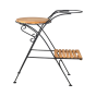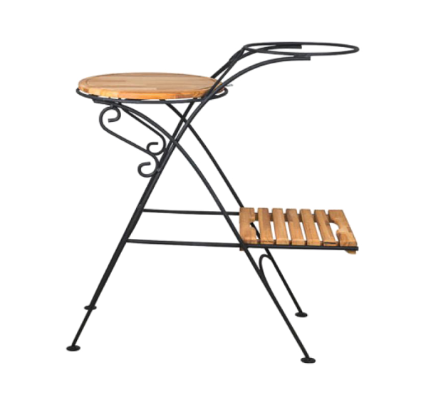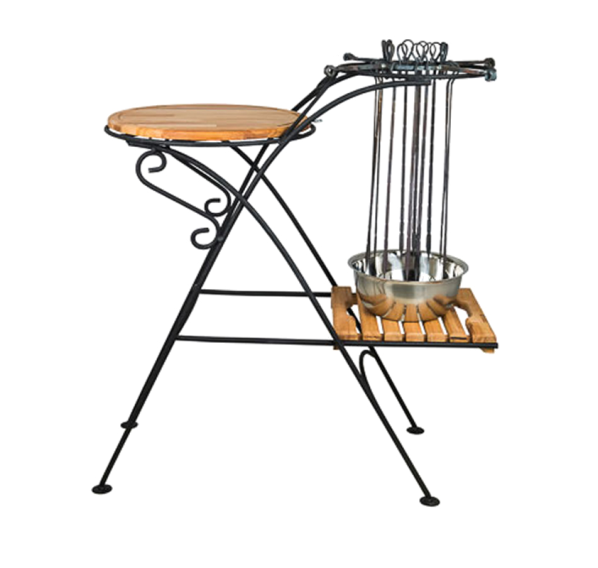 Основные элементы стойки выполнены из кованого металла, и украшены декоративными завитками. В качестве материала для столешницы и доски — натуральный бук.