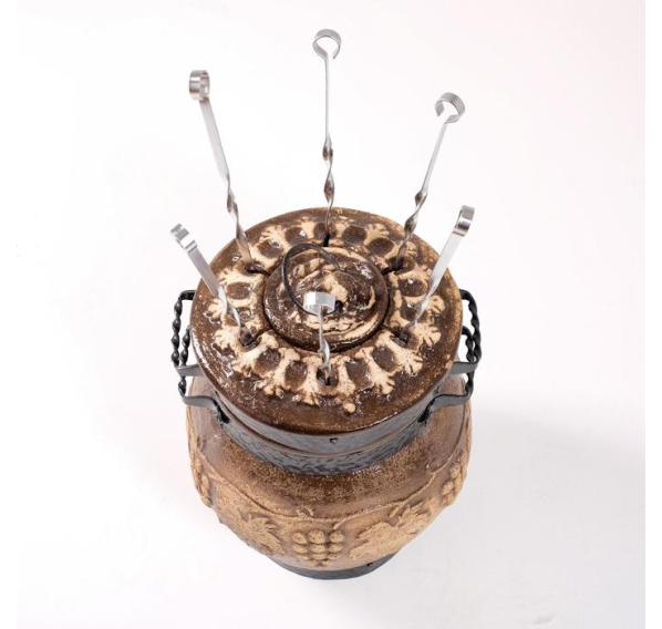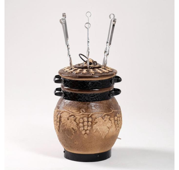 Электрический тандыр "Барельеф-Мини" с потребляемой мощностью 1,5 кВт позволяет готовить пищу не на улице, а в помещении. При этом никакого дыма или запаха не будет. Это очень удобно не только для семейного использования, но и для кафе, ресторанов и баров. Для безопасного использования тандыр заключён в стальную окантовку с элементами ковки, поэтому он не требует предварительного "закаливания".
