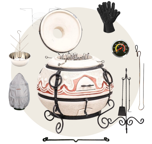 Приобрести тандыр с дополнительными аксессуарами в комплекте выйдет дешевле, нежели докупать всё по-отдельности. Комплект включает в себя самые необходимые аксессуары допустимые к данной модели тандыра.