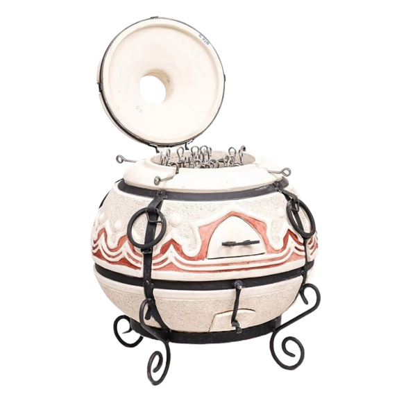 Самый большой из нестационарных тандыров, предлагаемых нашим магазином. Его размеры позволяют жарить мясо (и другие продукты) одновременно на 20 шампурах! Кроме того, удобная широкая горловина позволяет использовать его для выпечки лепёшек, самсы и других блюд из теста. Третья отличительная особенность тандыра "Амфора-Восточный" — он изначально поставляется с коваными ножками — это удобно и практично. Для остальных тандыров ножки доступны только в качестве опции. Также тандыр оснащён удобным механизмом открывания крышки, который значительно облегчает работу с тандыром, а также экономит Ваше рабочее место на столе.