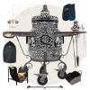 тандыр, шампуры, кочерга, совок, колосник, крестовина, термометр, жароотсекатель, столик - 2 шт., колёса - 4 шт., дополнительный колпачок, чехол на тандыр, рукавицы-прихватки, зольный ящик, сумка-переноска-дровница, этажерка 3-х ярусная большая и т.д.