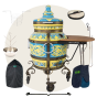 тандыр, шампуры, кочерга, совок, колосник, приспособление для подвешивания шампуров, термометр, жароотсекатель, столик, колёса - 4 шт., чехол на тандыр, этажерка 3-х ярусная большая, ёлочка 28 см с высоким бортом и т.д.