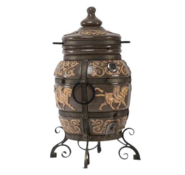 Тандыр "ЭКОтандыр-Перс-Толпар" — для требовательных, но оригинальных гурманов. Большой размер и широкая горловина сочетается с изысканной формовкой от большего к малому: в корпус тандыра помещается от двух до более закладок различных блюд, а термометр, удобно размещённый на корпусе, оперативно измерит прогрев толстых стенок. Тандыр пронизан отголосками к тюркской культуре — на его корпусе красуется глянцевый Толпар (в переводе означает "Крылатый конь"), что является его изюминкой и оригинальной чертой. Опорой тандыру служат устойчивые кованые ножки. Тандыр "ЭКОтандыр-Перс-Толпар" впишется в любой загородный дом, дачу или коттедж, согревая и обеспечивая комфорт в использовании.