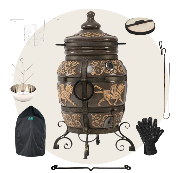 Приобрести тандыр с дополнительными аксессуарами в комплекте выйдет дешевле, нежели докупать всё по-отдельности. Комплект включает в себя самые необходимые аксессуары допустимые к данной модели тандыра.