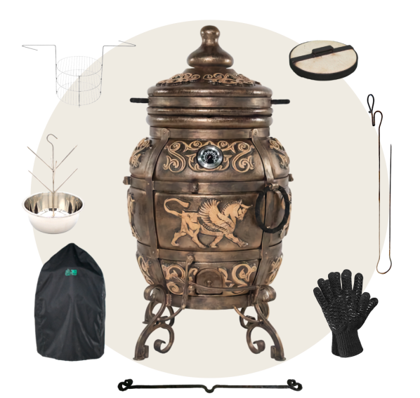 Приобрести тандыр с дополнительными аксессуарами в комплекте выйдет дешевле, нежели докупать всё по-отдельности. Комплект включает в себя самые необходимые аксессуары допустимые к данной модели тандыра.