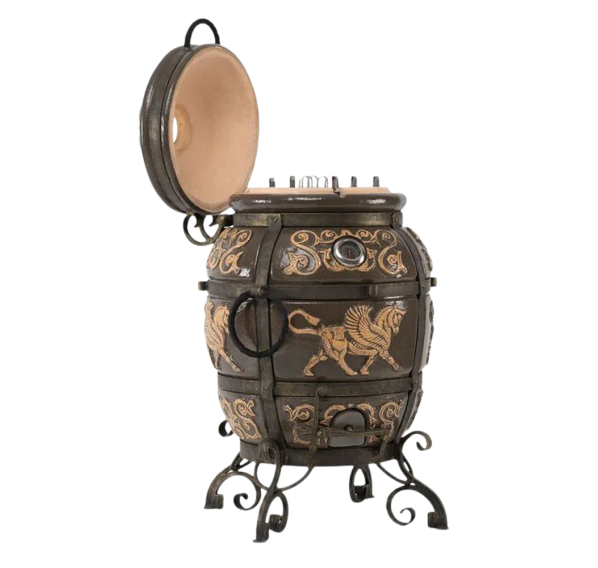 Тандыр "ЭКОтандыр-Перс-Толпар" — для требовательных, но оригинальных гурманов. Большой размер и широкая горловина сочетается с изысканной формовкой от большего к малому: в корпус тандыра помещается от двух до более закладок различных блюд, а термометр, удобно размещённый на корпусе, оперативно измерит прогрев толстых стенок. Тандыр пронизан отголосками к тюркской культуре — на его корпусе красуется глянцевый Толпар (в переводе означает "Крылатый конь"), что является его изюминкой и оригинальной чертой. Опорой тандыру служат устойчивые кованые ножки. Тандыр "ЭКОтандыр-Перс-Толпар" впишется в любой загородный дом, дачу или коттедж, согревая и обеспечивая комфорт в использовании.