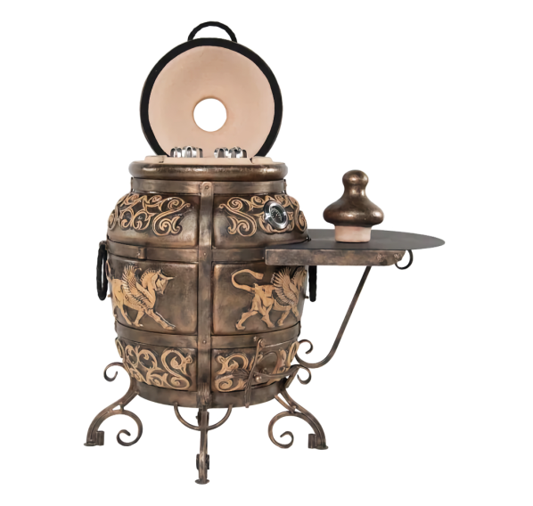 Тандыр "ЭКОтандыр-Перс-Толпар" — для требовательных, но оригинальных гурманов. Большой размер и широкая горловина сочетается с изысканной формовкой от большего к малому: в корпус тандыра помещается от двух до более закладок различных блюд, а термометр, удобно размещённый на корпусе, оперативно измерит прогрев толстых стенок. Тандыр пронизан отголосками к тюркской культуре — на его корпусе красуется глянцевый Толпар (в переводе означает "Крылатый конь"), что является его изюминкой и оригинальной чертой. Опорой тандыру служат устойчивые кованые ножки. Тандыр "ЭКОтандыр-Перс-Толпар" впишется в любой загородный дом, дачу или коттедж, согревая и обеспечивая комфорт в использовании.