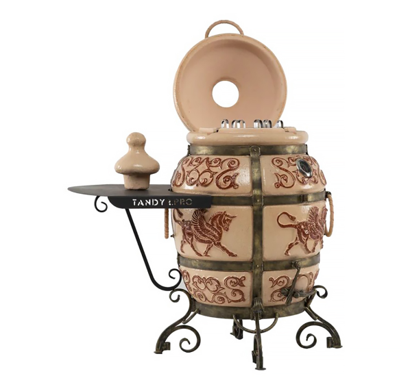 Тандыр "ЭКОтандыр-Перс-Толпар" — для требовательных, но оригинальных гурманов. Большой размер и широкая горловина сочетается с изысканной формовкой от большего к малому: в корпус тандыра помещается от двух до более закладок различных блюд, а термометр, удобно размещённый на корпусе, оперативно измерит прогрев толстых стенок. Тандыр пронизан отголосками к тюркской культуре — на его корпусе красуется глянцевый Толпар (в переводе означает "Крылатый конь"), что является его изюминкой и оригинальной чертой. Опорой тандыру служат устойчивые кованые ножки. Тандыр "ЭКОтандыр-Перс-Толпар" впишется в любой загородный дом, дачу или коттедж, согревая и обеспечивая комфорт в использовании.