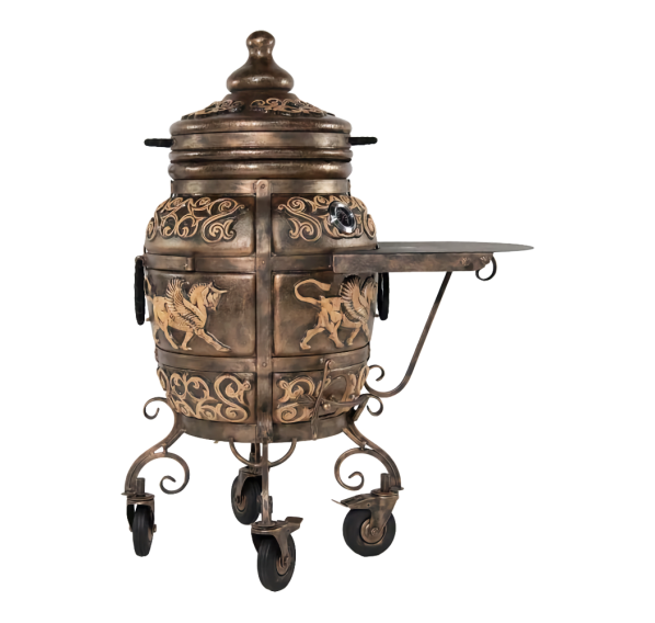 Тандыр "ЭКОтандыр-Перс-Толпар" — для требовательных, но оригинальных гурманов. Большой размер и широкая горловина сочетается с изысканной формовкой от большего к малому: в корпус тандыра помещается от двух до более закладок различных блюд, а термометр, удобно размещённый на корпусе, оперативно измерит прогрев толстых стенок. Тандыр пронизан отголосками к тюркской культуре — на его корпусе красуется глянцевый Толпар (в переводе означает "Крылатый конь"), что является его изюминкой и оригинальной чертой. Опорой тандыру служат устойчивые кованые ножки. Тандыр "ЭКОтандыр-Перс-Толпар" впишется в любой загородный дом, дачу или коттедж, согревая и обеспечивая комфорт в использовании.