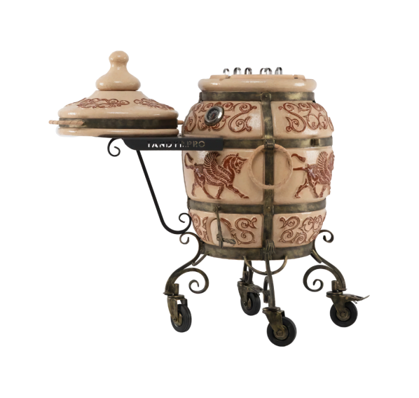 Тандыр "ЭКОтандыр-Перс-Толпар" — для требовательных, но оригинальных гурманов. Большой размер и широкая горловина сочетается с изысканной формовкой от большего к малому: в корпус тандыра помещается от двух до более закладок различных блюд, а термометр, удобно размещённый на корпусе, оперативно измерит прогрев толстых стенок. Тандыр пронизан отголосками к тюркской культуре — на его корпусе красуется глянцевый Толпар (в переводе означает "Крылатый конь"), что является его изюминкой и оригинальной чертой. Опорой тандыру служат устойчивые кованые ножки. Тандыр "ЭКОтандыр-Перс-Толпар" впишется в любой загородный дом, дачу или коттедж, согревая и обеспечивая комфорт в использовании.