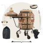 тандыр, шампуры, кочерга, совок, колосник, приспособление для подвешивания шампуров, термометр, жароотсекатель, столик, чехол на тандыр, колёса - 4 шт., этажерка 3-х ярусная большая, ёлочка 28 см с высоким бортом, шампур двойной, перекладина, перчатки