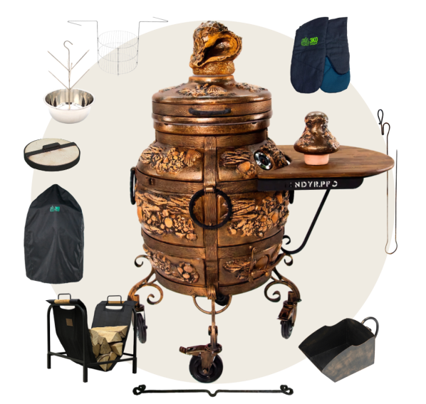 тандыр, шампуры, кочерга, совок, колосник, крестовина, термометр, жароотсекатель, столик, колёса - 4 шт., дополнительный колпачок, чехол на тандыр, рукавицы-прихватки, зольный ящик, сумка-переноска-дровница, этажерка 3-х ярусная большая и т.д.
