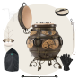 тандыр, шампуры, кочерга, совок, колосник, приспособление для подвешивания шампуров, термометр, жароотсекатель, чехол на тандыр, этажерка 3-х ярусная большая, ёлочка 28 см с высоким бортом, шампур двойной, перекладина, перчатки