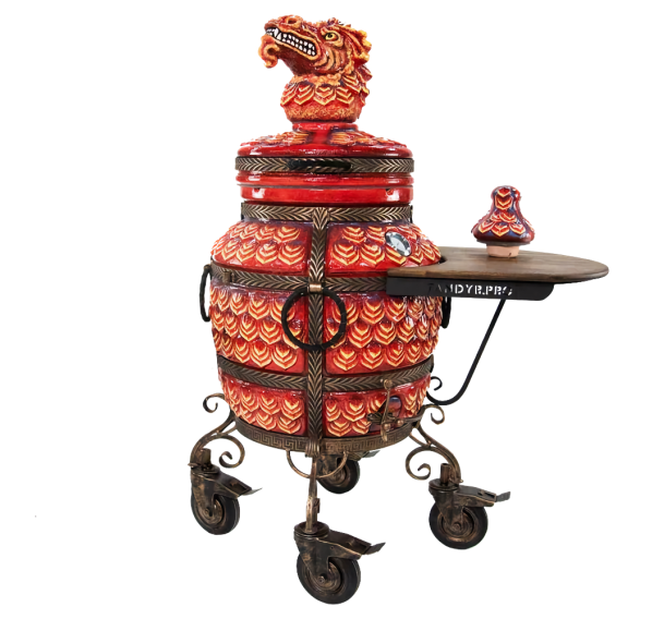 Именно с модели "ЭКОтандыр-Шёлковый-путь" началась серия эксклюзивных тандыров. Когда мы упоминаем шёлковый путь, то ассоциации неизменно приводят нас в Китай. Дракон — это символ доброго начала, символ могущественного покровителя. Корпус, крышка и колпачок словно покрыты чешуей. Образ дополняет подарочный колпачок в виде головы дракона — к каждому тандыру скульпторы создают его вручную. Сочетая разнообразные техники ручной формовки, мастера при помощи скульпторов создают уникальные изделия.