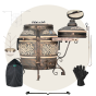 тандыр, шампуры, кочерга, совок, колосник, приспособление для подвешивания шампуров, термометр, жароотсекатель, столик, чехол на тандыр, этажерка 3-х ярусная средняя, ёлочка 21 см с высоким бортом, шампур двойной, перекладина, перчатки