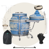 тандыр, шампуры, кочерга, совок, колосник, приспособление для подвешивания шампуров, термометр, жароотсекатель, столик, чехол на тандыр, этажерка 3-х ярусная средняя, ёлочка 21 см с высоким бортом, шампур двойной, перекладина, перчатки