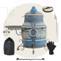 тандыр, шампуры, кочерга, совок, колосник, приспособление для подвешивания шампуров, термометр, жароотсекатель, столик, чехол на тандыр, этажерка 3-х ярусная средняя, ёлочка 21 см с высоким бортом, шампур двойной, перекладина, перчатки
